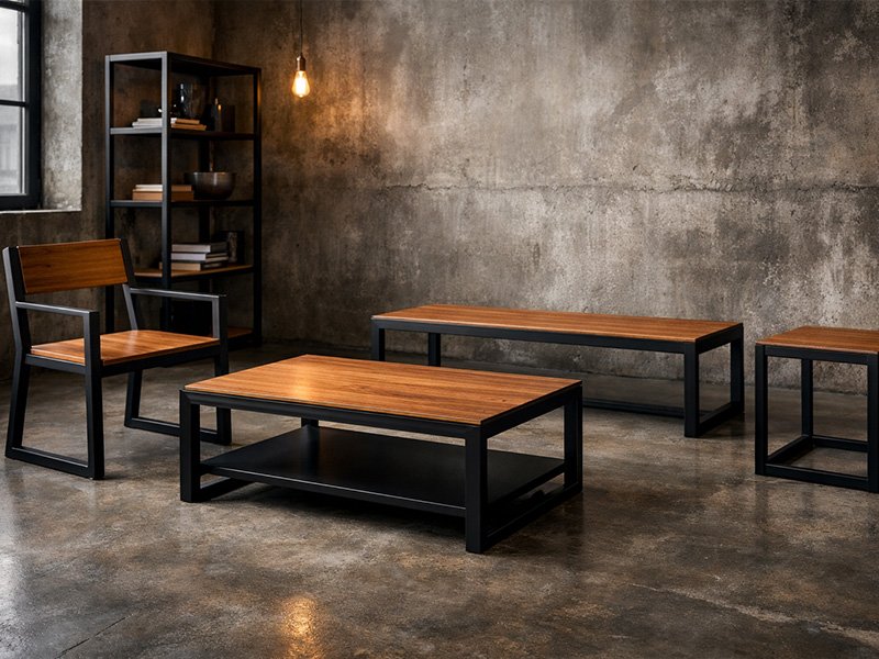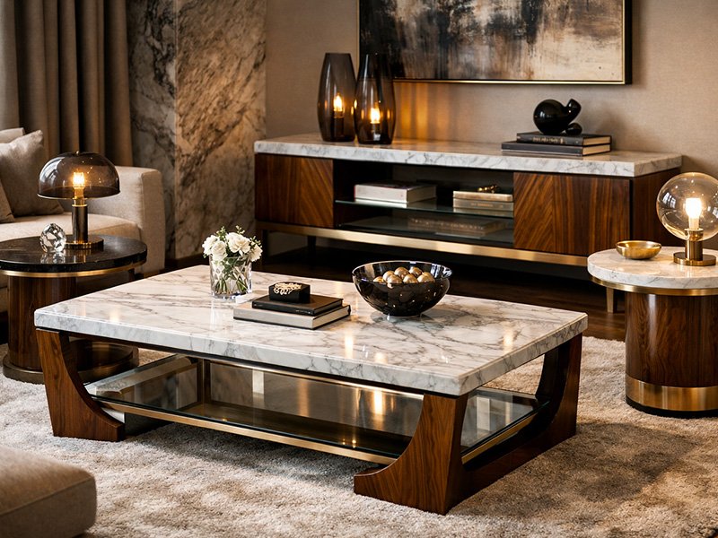 Metal + solid wood + veneer, with marble/resin accents—engineered for strength, balance, and