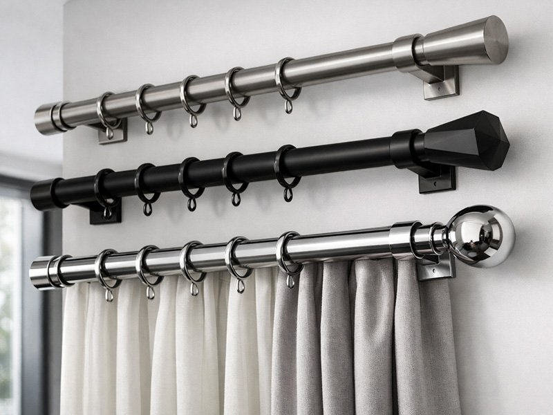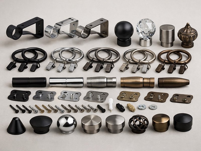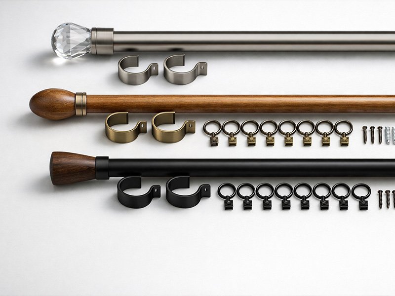 Rod sets, finials, brackets, rings, tiebacks/holdbacks—coordinated finishes for complete drapery